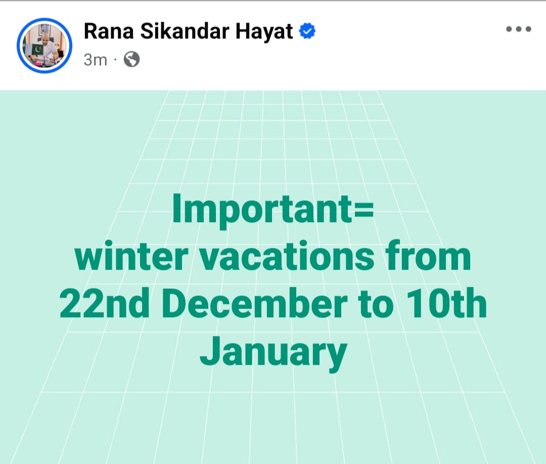 Winter Vacations Announced from 22nd December to 10th January – Official Update by Rana Sikandar Hayat.